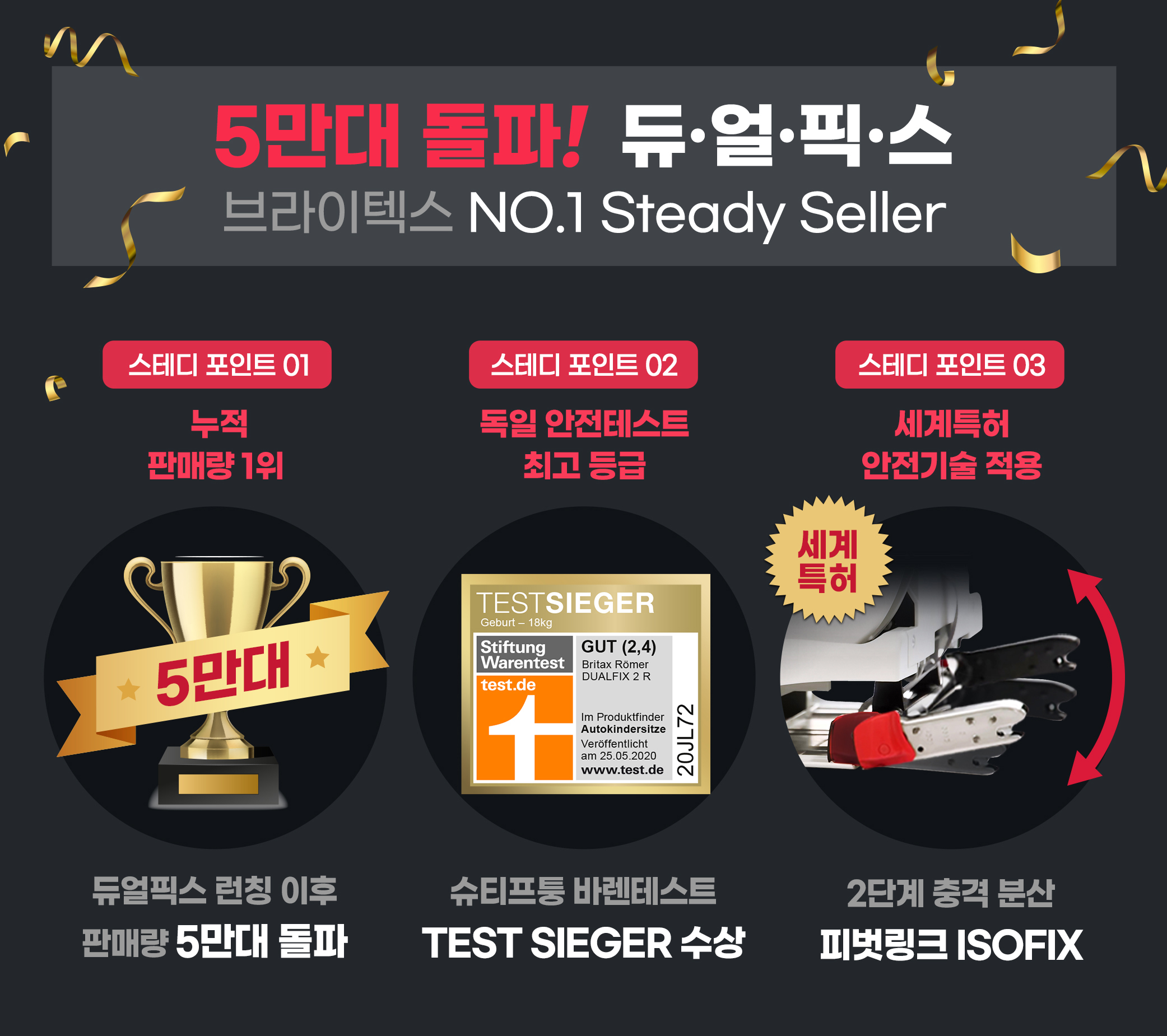 브라이텍스는 이번 이벤트를 통해 많은 이들의 사랑을 받을 수 있었던 듀얼픽스2의 ‘스테디 포인트’를 공개함과 동시에 고객들의 성원에 감사한 마음을 전하고자 다양한 혜택을 준비했다고 밝혔다. 듀얼픽스2가 브라이텍스의 스테디셀러임을 입증하는 스테디 포인트는 3가지로 ▲누적 판매량 5만대 돌파 ▲독일 안전테스트 최고 등급 수상 ▲세계특허 피벗링크 ISOFIX를 꼽았다.